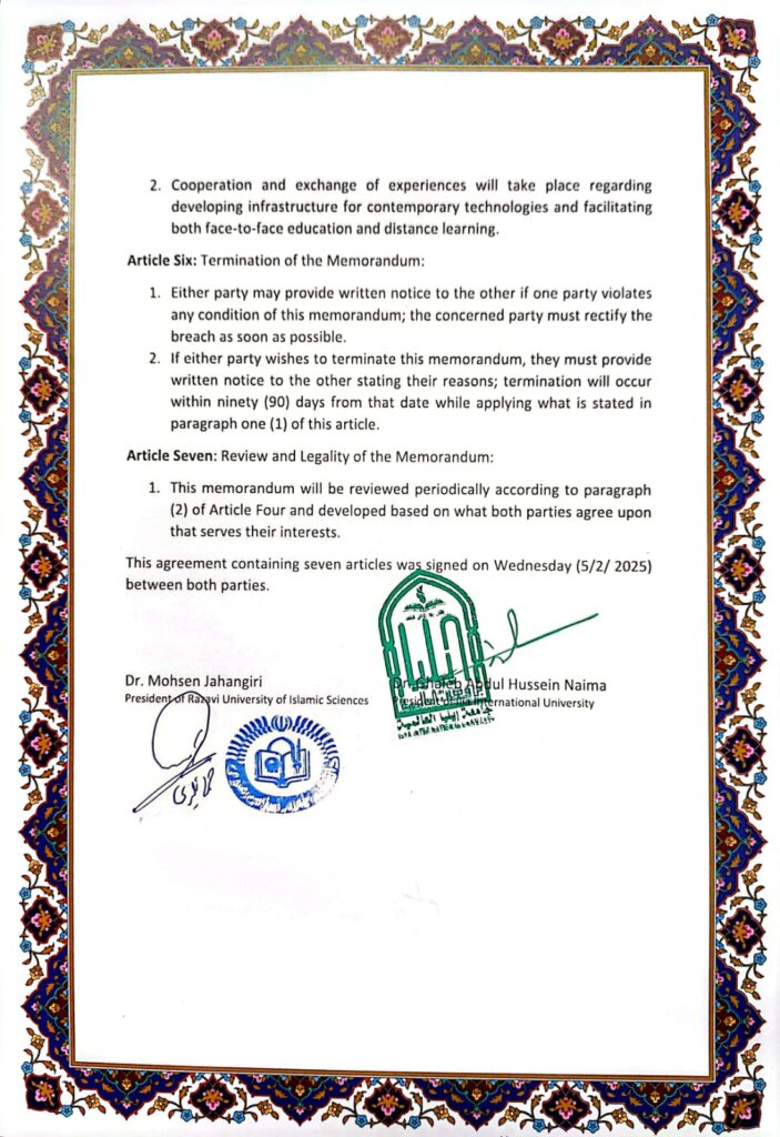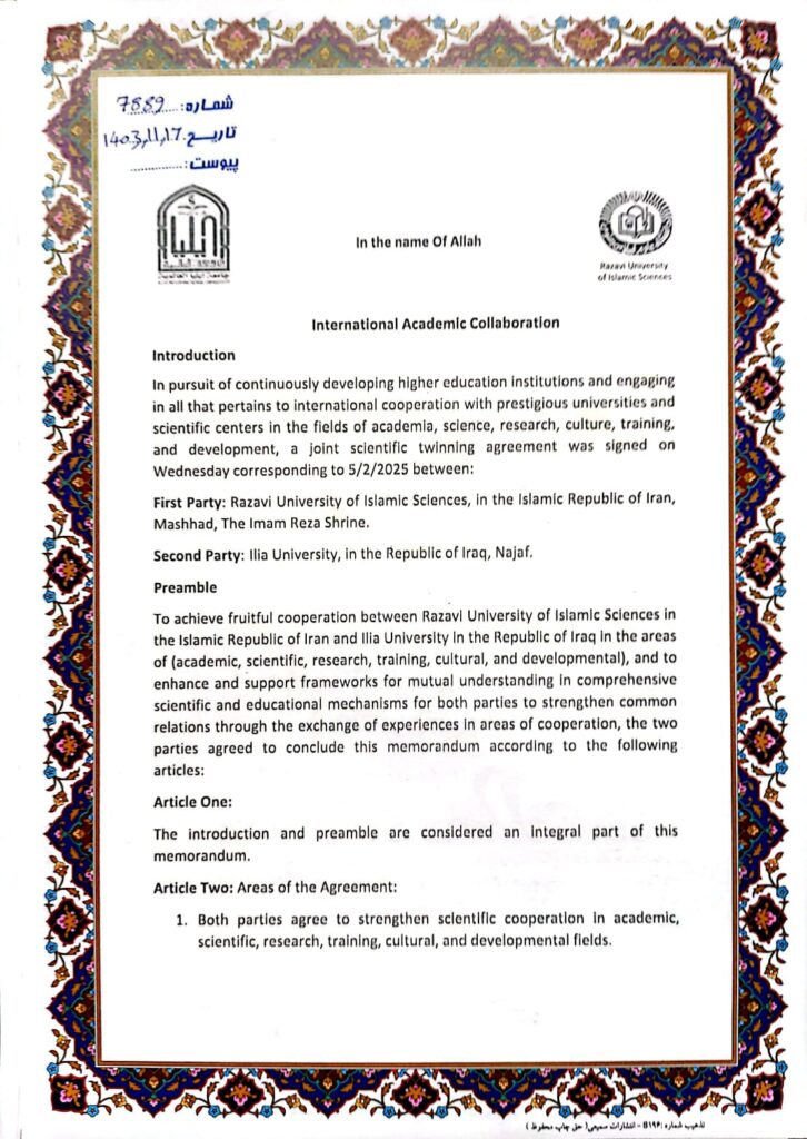 جامعة ايليا العالمية I.I.U توقع اتفاقية علمية مشتركة مع الجامعة الرضوية للعلوم الاسلامية